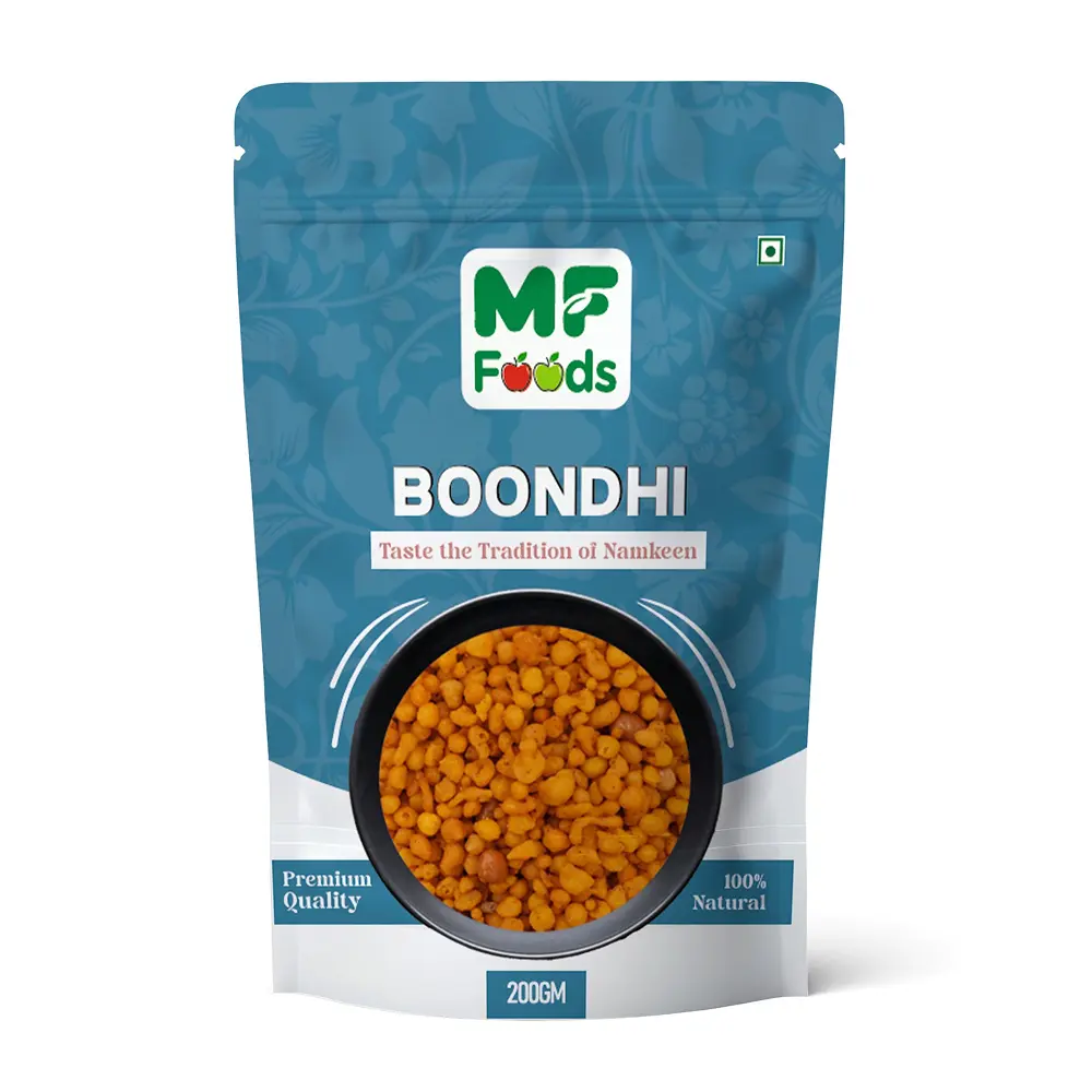 Boondhi is a classic Indian namkeen made from tiny, crisp fried gram flour droplets. Mildly spiced and irresistibly crunchy, it’s perfect for munching, garnishing chaats, or adding flavor to raitas and curries.
